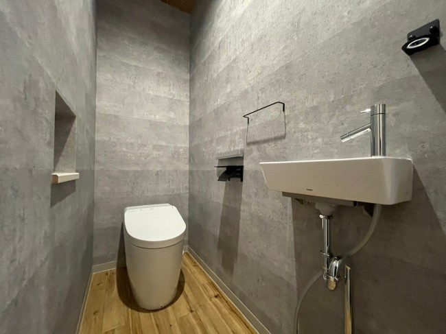 モルタル風ニュアンスで雰囲気のあるレストルーム。優しい照明の光が、より空間を引き立てます。
