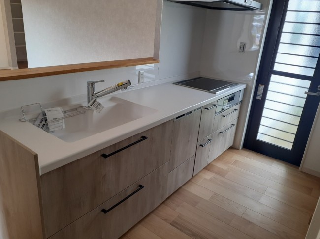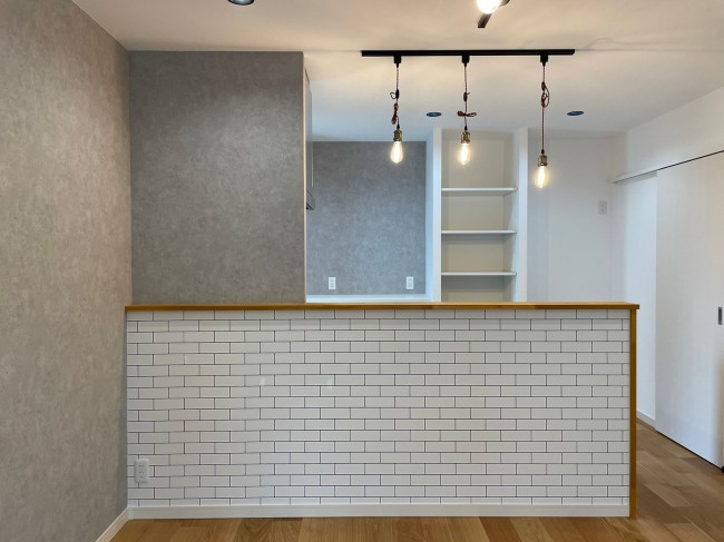 カウンターキッチンにはタイル調のクロスを採用。シンプルすぎず、可愛らしい印象のキッチン。壁紙との色味が相性抜群です!