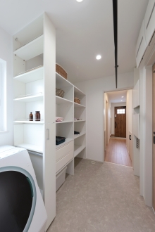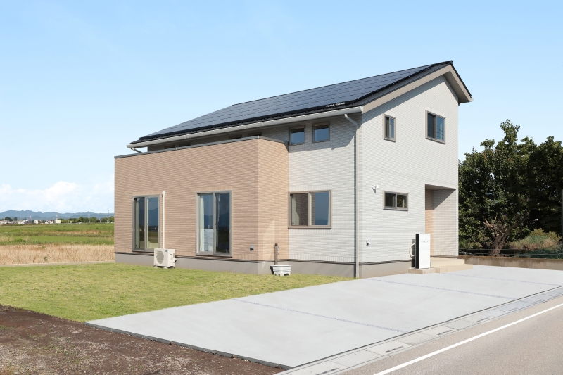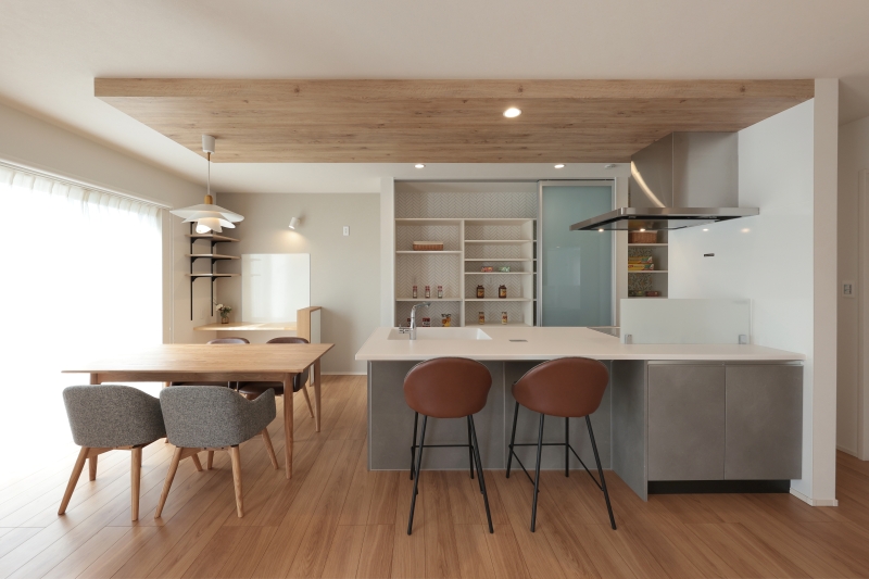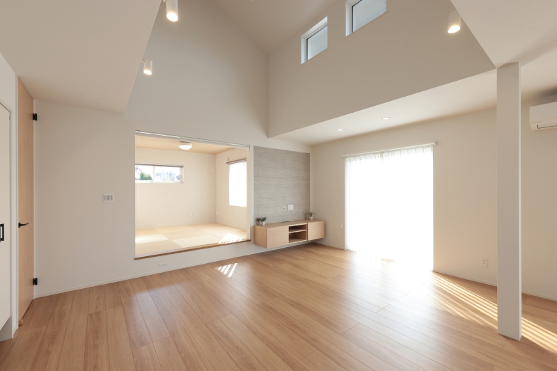 大きな吹き抜けのあるリビングは、開放感と明るさが心地よく、自然と家族が集まる特別な空間に。隣にはくつろぎの小上がり和室を設け、昼寝やお子様の遊び場にもぴったりです。キッチンには木目の下がり天井を採用し、温もりのある雰囲気に。太陽光発電+テスラの蓄電池で、災害時も安心。さらに小屋裏収納で、暮らしにゆとりと賢さをプラス。心地よさと機能性を両立した住まいです。