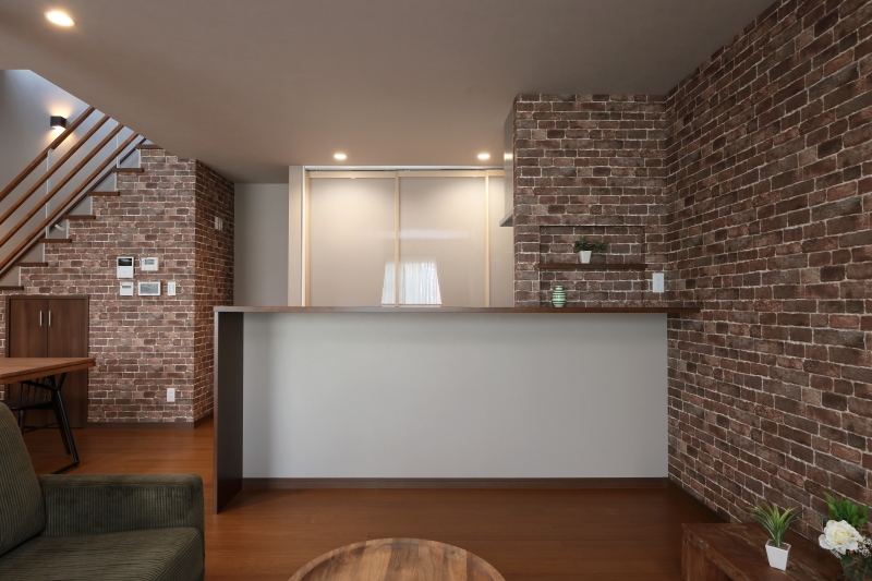 タイル調の外観が目を引くお家。LDKは、レンガ調クロスをアクセントにしたおしゃれな空間に仕上げました。リビング階段が吹き抜けとつながり、開放感もたっぷり。ダイニング横には小上がりの和室を設け、くつろぎの場としても活用できます。和室には本棚とカウンターを設置しており、お子さまの勉強スペースや読書コーナーにもぴったり。洗面室には大型の収納棚を備え、家族みんなが使いやすく片付けやすい工夫がされています。