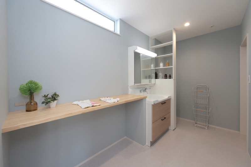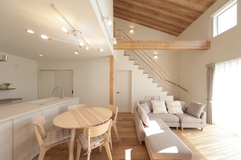 メンテナンスフリーの外観が魅力の住まい。室内は、毎日の暮らしをぐっと快適にする家事ラク動線を採用しました。開放感あふれる吹き抜けリビングにはたっぷりの自然光が差し込み、明るく心地よい空間に。リビング階段で家族のつながりも自然に生まれます。天井の美しい木目や力強い梁、白を基調としたインテリアが調和し、ぬくもりと上質さを感じる住まいに仕上がりました。家族みんなが心地よく過ごせる、やさしい空間です。