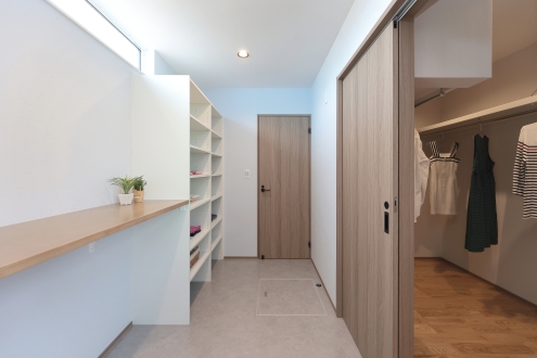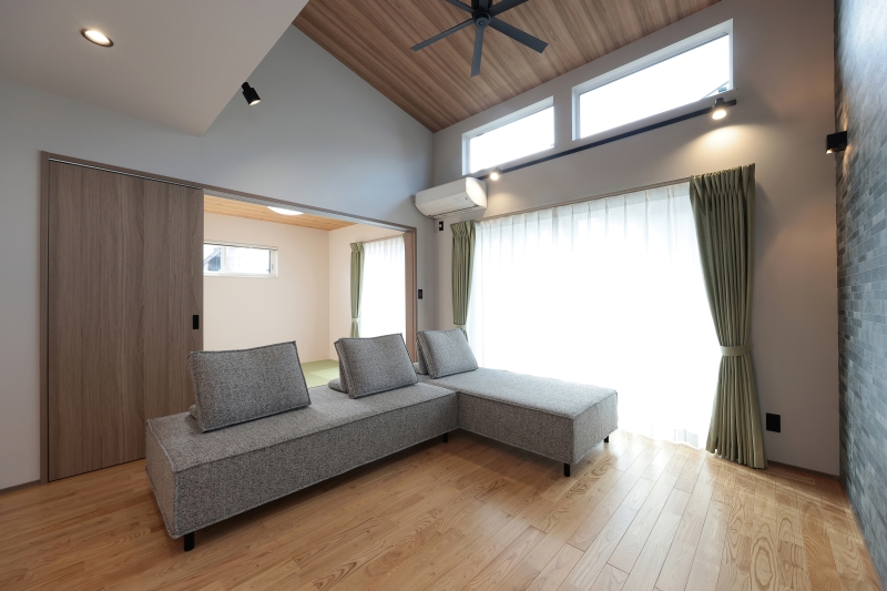 勾配天井と木目クロスがつくる、開放感あふれる心地よいリビング。TV背面にはアクセントクロスを取り入れ、空間にメリハリをプラスしました。隣には和室がつながり、くつろぎの幅も広がります。さらに、広々としたランドリールームにはカウンターを設置し、そのままウオークスルークローゼットへ続く動線で家事効率もアップ。トイレには地球柄のアクセントクロスとペンダントライトを組み合わせ、遊び心あるおしゃれな空間に。毎日の暮らしがもっと快適になる、家事ラクを叶えた平屋の住まいです。