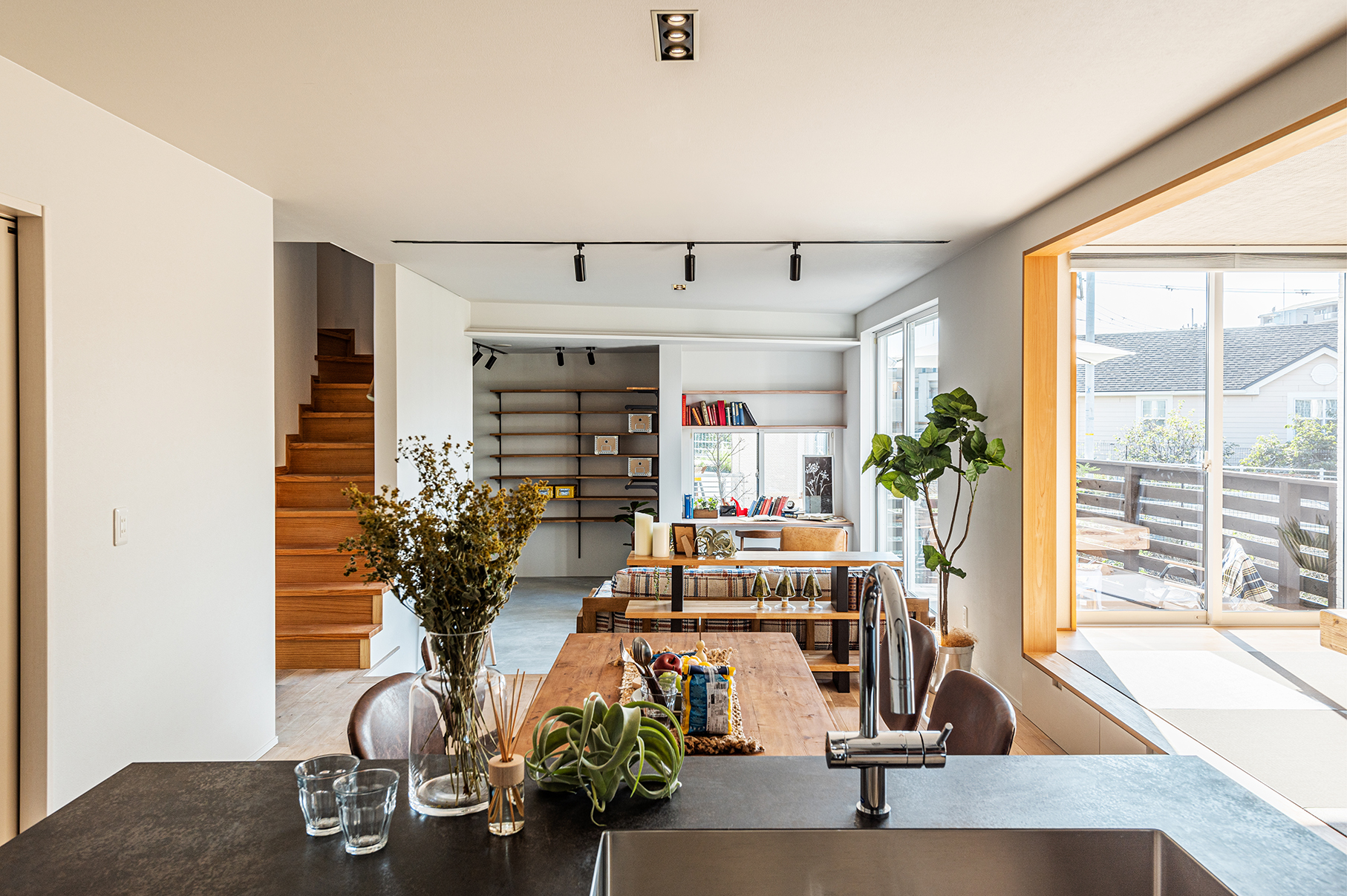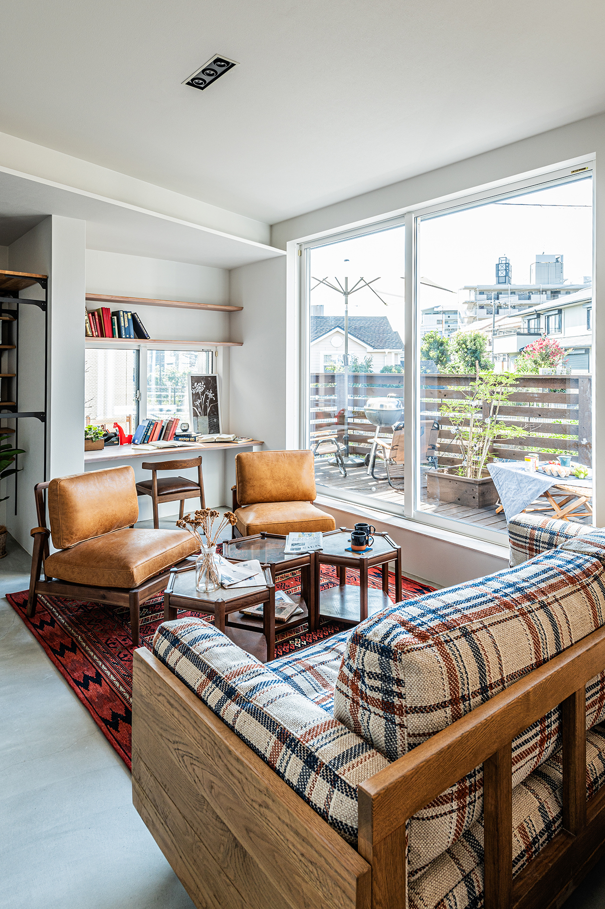 濃い目の家具も映える床の土間でウッドデッキまで靴で過ごす欧米スタイル。ウッドデッキには丁度良いウッドフェンスでプライバシーを確保しました。