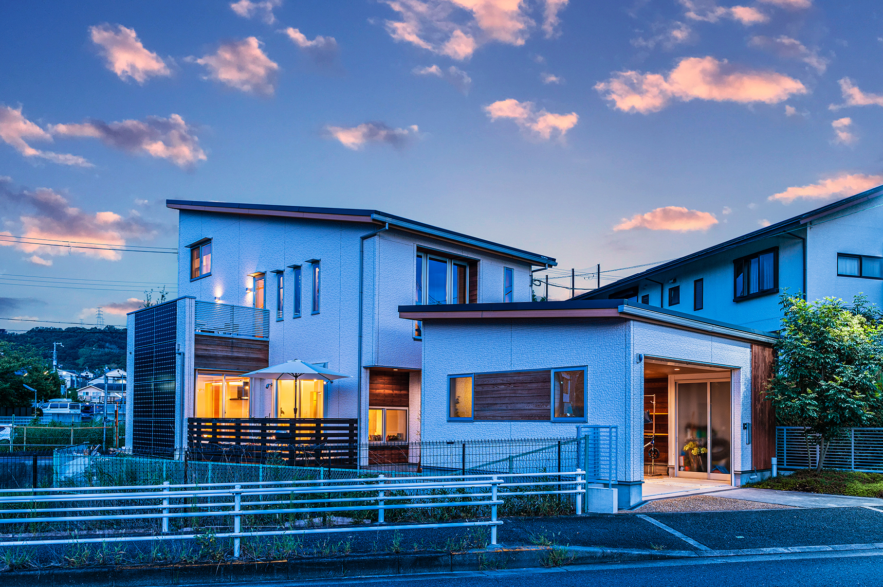 狭小地に建つ、収納付きガレージのあるお家は2か所のデッキスペースあり、屋根だけではない側面に垂直式の太陽光パネルを搭載しております。