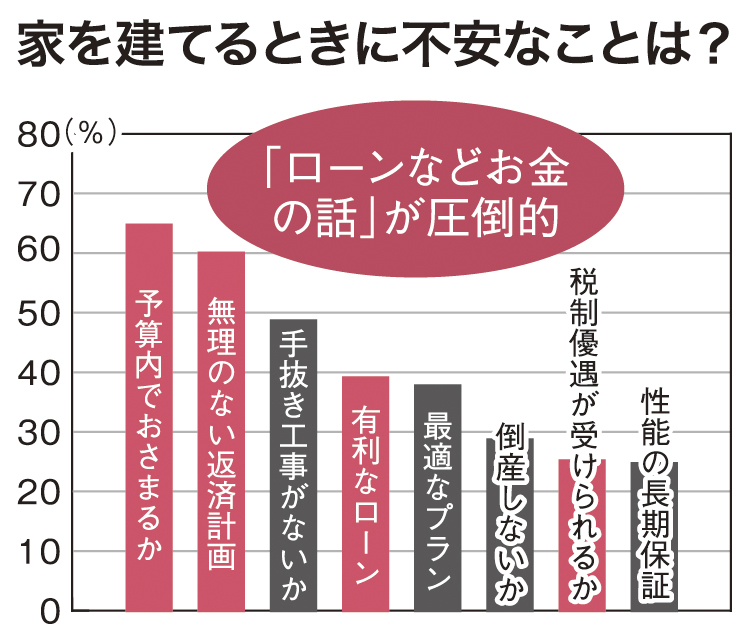 調査によると、「家を建てるときに不安なこと」は、「予算内でおさまるか」「無理のない返済計画」「有利な住宅ローン」「税制優遇が受けられるか」など、お金に関する内容が圧倒的に多いことが分かっています。