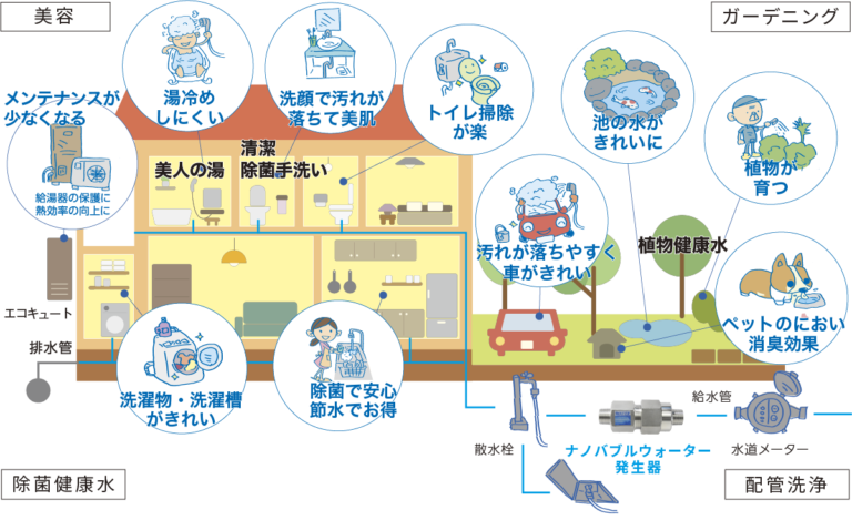 ナノバブルウォーターを住宅の水回りに取り入れることで、次のような効果が期待できます。