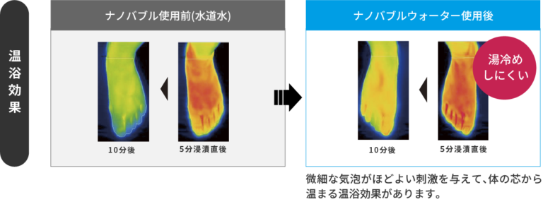 ナノバブルウォーターの湯船に入ると、微細な泡が皮膚にほどよい刺激を与え、血行を促進。体を芯から温める温浴効果を発揮します。入浴後に湯冷めしにくく、ポカポカとリラックスした心地が続きます。