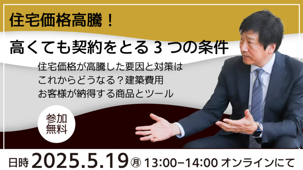 ウッドショックから始まった建材の高騰は建築価格を急激に押し上げました。それにより、今まで予定していた家づくりのスケジュール・プランの変更を余儀なくされた方も少なくありません。 しかし、今後も住宅建築費用の上昇は続いていくと思われます。 ビルダーとして、住宅建築費用の上昇にどのように対処していくかが今問われています。本セミナーでは、建築資金があがっても魅力を失わない商品とアピールすべきお客様層について、共に学んでいきます。