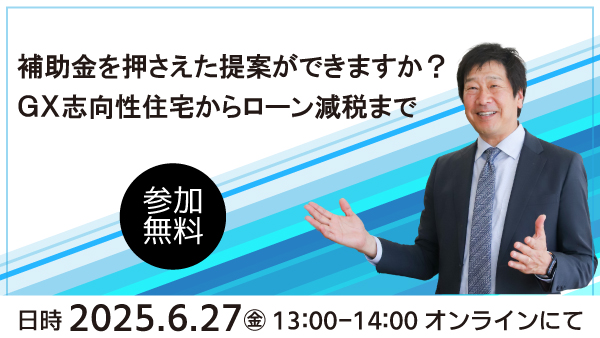 2025年はGX志向性住宅をはじめ、子供エコなどの補助金がにぎやかです。 特に住宅価格が高騰し始めて今まで以上に補助金に注目が集まっています。その補助金も住宅商品によって適用されるかされないかが決まります。 補助金をうまく活用した提案をすることでお客様の生活が“がらり”と変わることもあり得ます。 知識と商品活用によりお客様へ魅力ある提案から家づくりへと導いていきましょう!