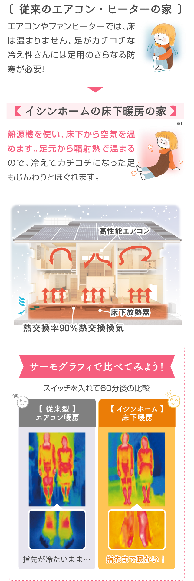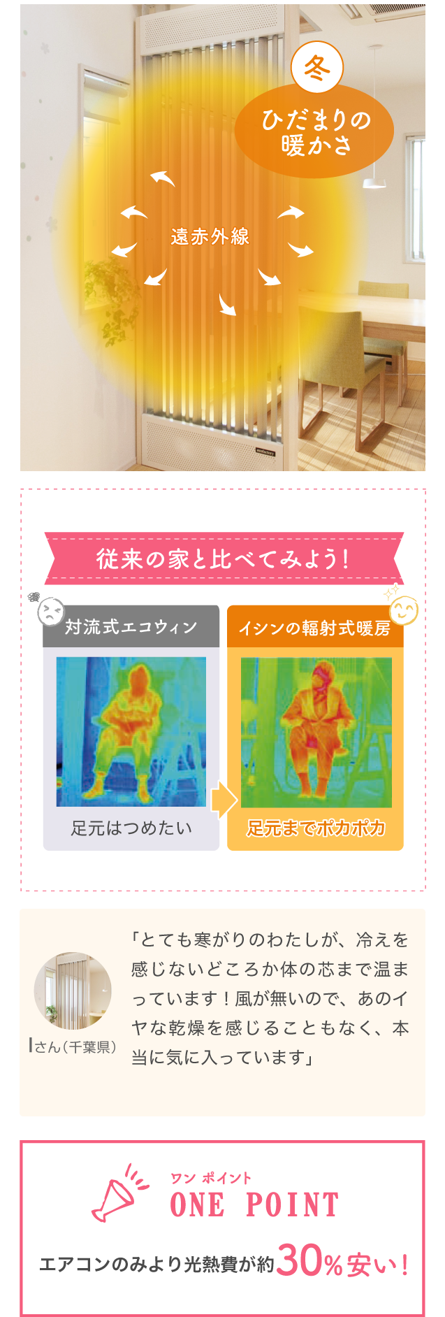 赤外線の力で家も人も芯から温める輻射式暖房。冷えやすい足先や指までぽかぽかに。しかも乾燥しないからお肌に嬉しい♪