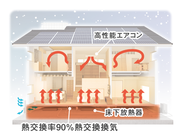 さらに、熱源機を使った床下暖房なら乾燥を防ぎながら足元からぽっかぽか。イシンホームの床下暖房は全館空調とセットだから家中どこでもあったか~い。