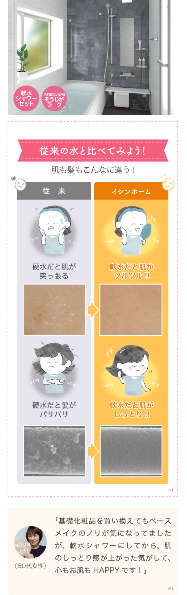 ※1 効果には個人差があります。効果の持続のためには5~7年ごとのフィルター交換が必要です。クリン軟水はシャワーのみです。