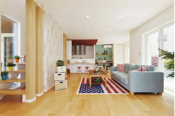 家族の大好きなカリフォルニアテイストのリビングで、みんなでカフェ気分。 リビングインテリアのテイストを家族の好みに合わせれば、お気に入りのスペースでくつろげますね。