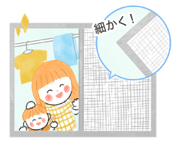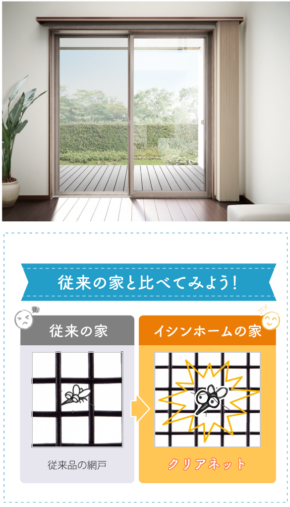 窓には従来品よりも20%目が細かいクリアネット網戸を装備。チョウバエやヒトスジシマカなど小さな虫も通しません。景色がクリアに見えて通風性も良い優れモノ。