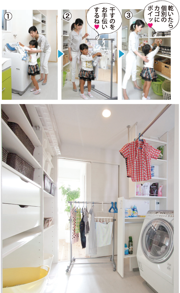 外干しの洗濯物に虫が付着して家に侵入することがあるんです。 虫の多い時期は室内に干すのがベター。イシンの家の洗濯室なら洗濯作業が 楽になって、24時間換気システムのおかげで室内でも乾きやすい。