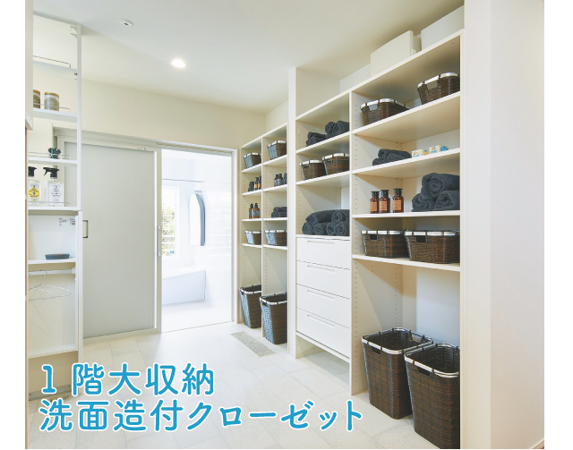 洗面脱衣室とクローゼットが一つに。洗面造り付け大型クローゼットには服、下着、日用品のストックなどたっぷりしまえる!