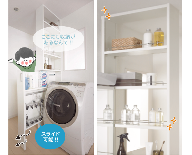 置き場に困る細々とした物は洗面所のデッドスペースを活用。アイデア満載の小物収納も造り付けだから片付けはしまうだけでラクラクOK。