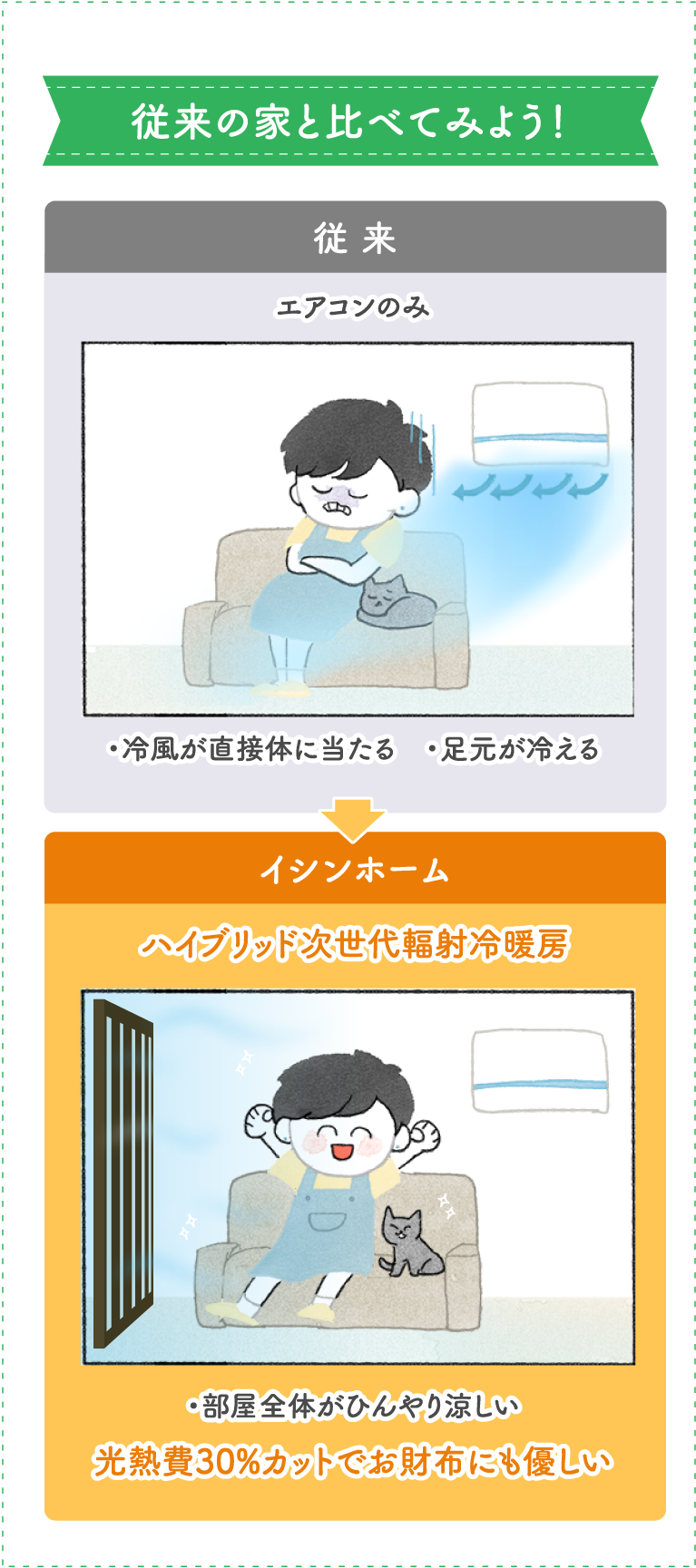 抜群の断熱性能と熱交換換気システム。この二つで外の熱気をシャットアウト。家全体が暑くなりにくい。エアコンの出番を減らします。