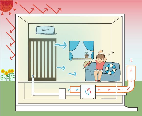 熱交換機能付きの換気システムだから、外の熱い空気を冷やして家の中に入れてくれる!涼しくてきれいな空気が家をめぐって快適。
