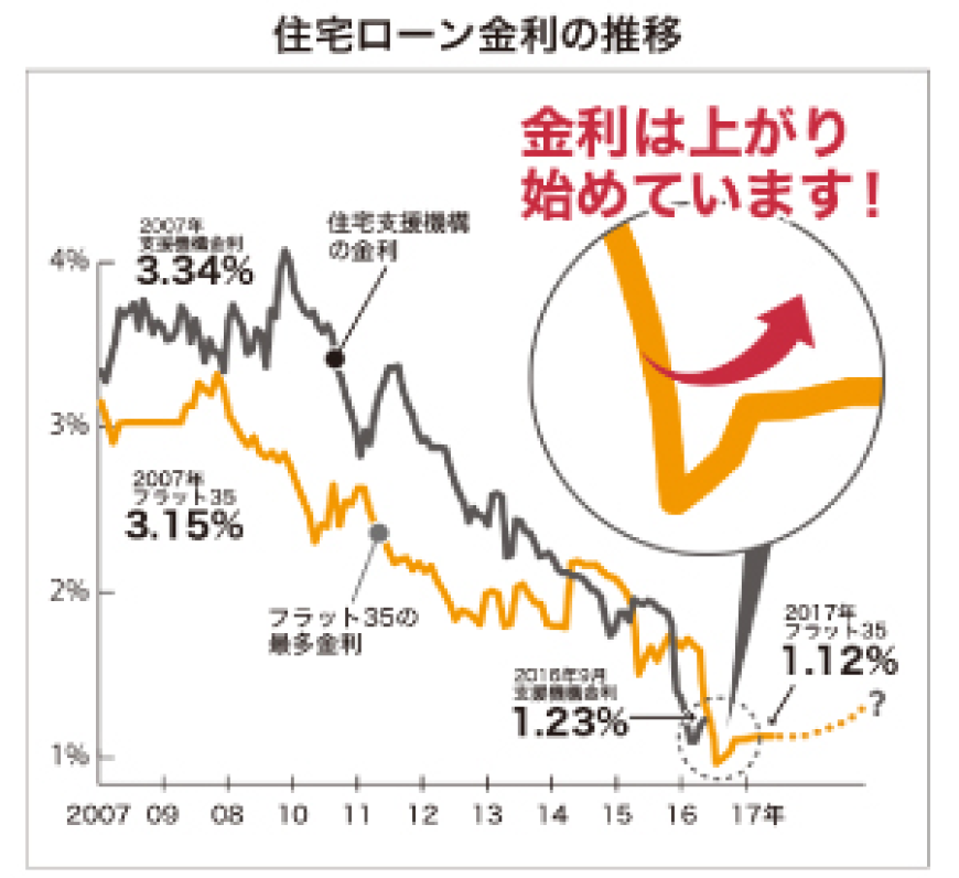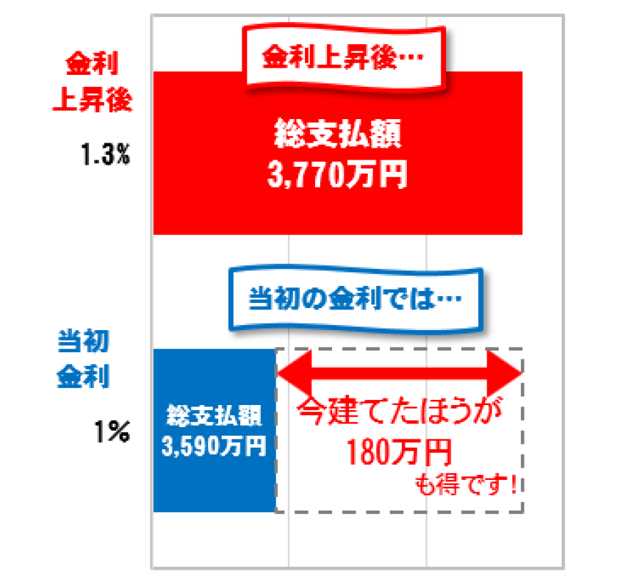 現在、住宅ローン金利は、日銀のマイナス金利政策のおかげで、歴史的な低水準にあり、まさに住宅ローンを利用する絶好の機会と言えるでしょう。仮に、3,000万円の借入で金利が0.3ポイント上がるだけでも、総支払額は約180万円も増えます(※当初1%の場合)