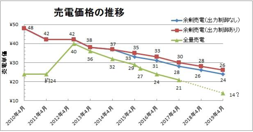 太陽光発電で発電した電力を電力会社が買い取ってくれる電力買取制度ですが、経済産業省は現在の価格から、2019年まで毎年引き下げる方針を発表しています。先になればなるほど、電力買取単価は下がる一方です。現在の単価で、太陽光発電をするのが最もお得です。